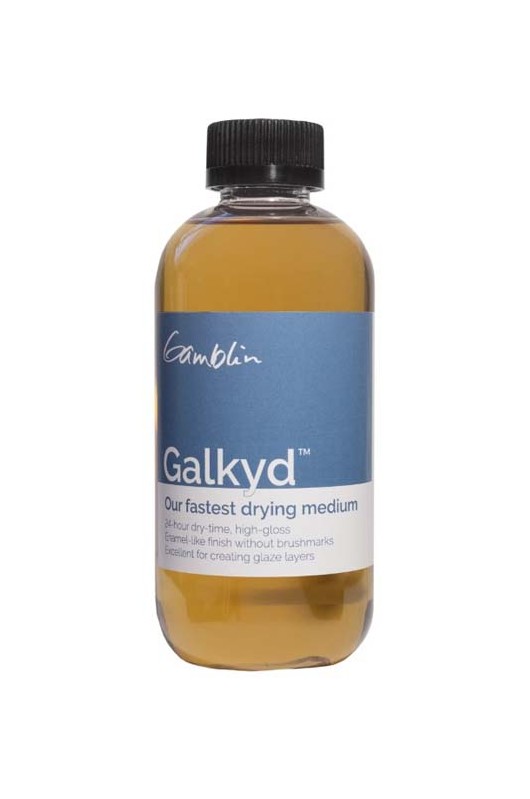 24 hour dry time. Our fastest drying painting medium. Galkyd thins oil colors and increases transparency and gloss. When used in greater proportions with oil color, Galkyd will level brush-strokes, creating an enamel-like surface. Great for creating glazes, apply glazes thinly. Do not pour apply. Not a varnish.