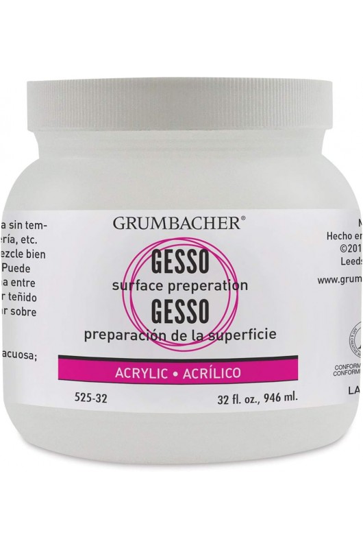 Grumbacher gesso prepares a number of porous substrates, such as canvas, wood, cardboard, plaster, and concrete, for painting with oil or acrylic colors. Not appropriate for egg tempera or gilding. Stir well and apply with brush to a clean surface. May be thinned with water. Sand between coats if desired to avoid wicking. May be tinted with acrylic colors. Do not mix with or apply over turpentine or oils. Available in 16oz. and 32 oz. jars. Made in the USA.