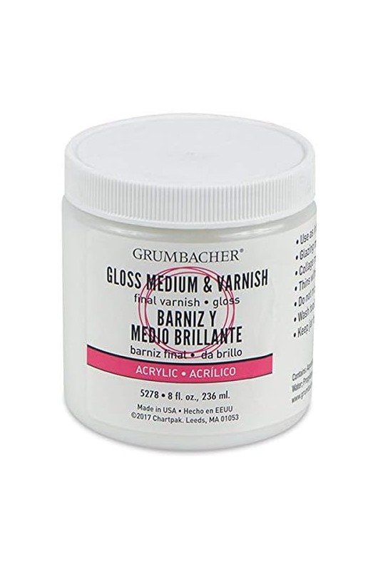 Excellent for mixed media applications, the acrylic gloss medium and varnish has myriad uses. Traditionally this medium is mixed with acrylic paint for smoother brush strokes and a uniform gloss finish, or as a final gloss varnish. This medium thins with water and can also be used for glazing, as an adhesive, in thick applications in molds or armatures for a flexible, plastic-like effect, and in papier mache projects. This is the ideal primer for oil painting on vellum. Dries clear, is flexible and water resistant when dry. Available in 8oz. jars. Made in the USA.