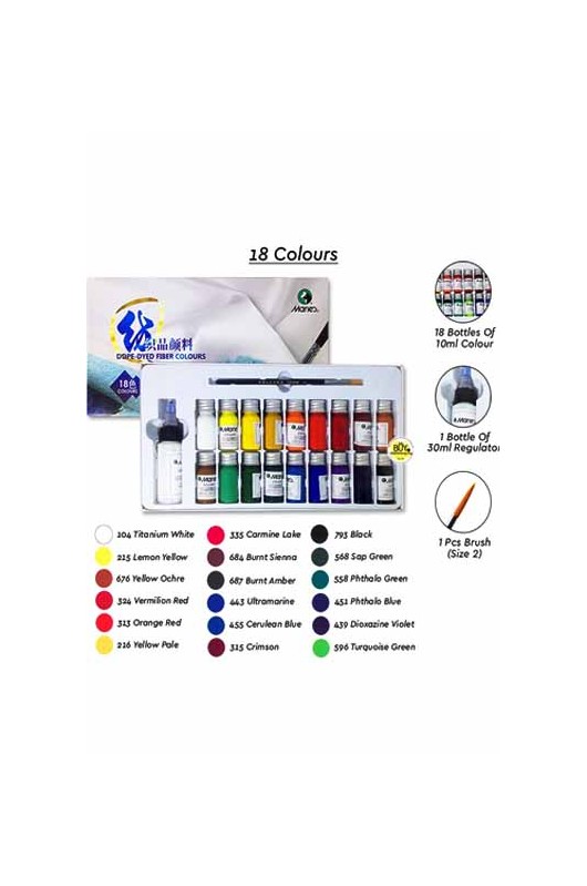 This Marie's Dope-Dyed Fiber Colours is safe and easy to use on fabric materials. Colours selection Up to 36 Marie's excellent bright and vibrant colours quality. It is water and wash resistant.Can be used for hand-painting on cotton, canvas and other textile products (it is recommended to add appropriate amount of material for dilution). You can add a appropriate amount of colours on the materials for colour blending (may use the Regulator provided) or the viscosity.