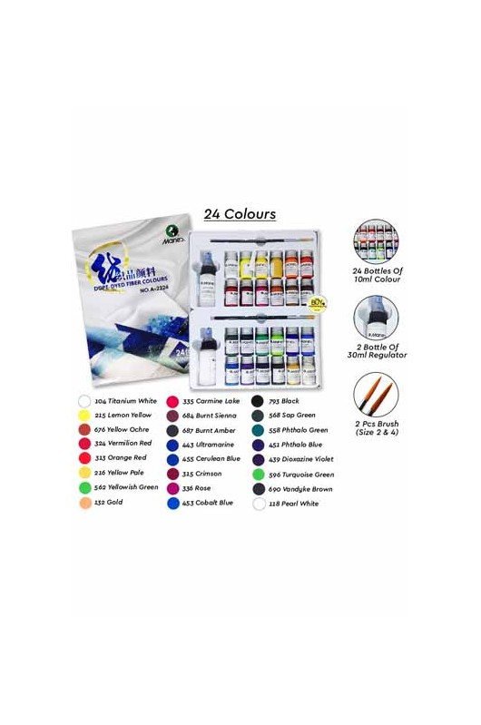 This Marie's Dope-Dyed Fiber Colours is safe and easy to use on fabric materials. Colours selection Up to 36 Marie's excellent bright and vibrant colours quality. It is water and wash resistant.Can be used for hand-painting on cotton, canvas and other textile products (it is recommended to add appropriate amount of material for dilution). You can add a appropriate amount of colours on the materials for colour blending (may use the Regulator provided) or the viscosity.