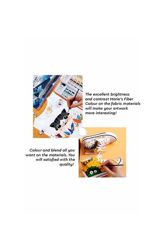 - The product is safe and easy to use on fabric materials - Up to 36 Marie's bright and vibrant colours (10ml per bottle) - Excellent Marie's colours brightness and contrast quality for your artwork - Water and wash resistant - Can be used for hand-painting on cotton, canvas and other textile products (it is recommended to add appropriate amount of material for dilution) - Add a appropriate amount of colours on the materials for colour blending (may use the Regulator provided) or the viscosity - Let the colours on fabric dry naturally, temperature treatment can enhance the adhesiveness - After 72 hours, let it dry thoroughly before washing. Avoid long soaking when washing for painted materials - Keep the bottle cap close after use to avoid the colour dry - Not suitable for kids 6 years old and below.