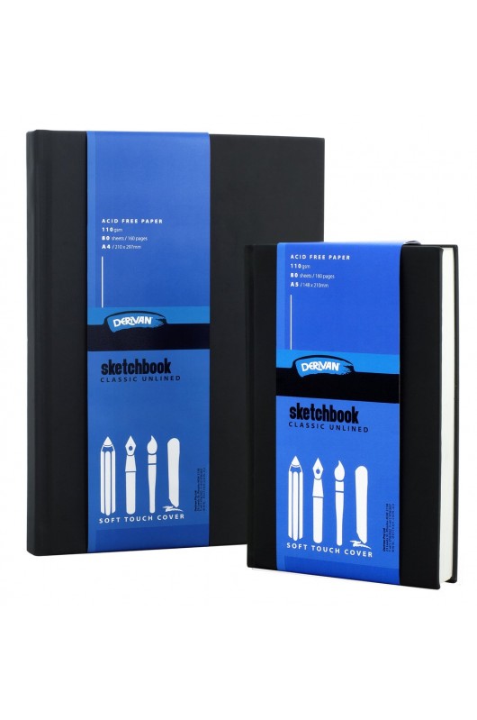 Classic Unlined or Tissue Interleaved. The NEW Derivan range of sketchbooks have a unique hard-bound black soft rubber cover. With a certain industrial design charm, the cover remains water resistant and is easier to hold. Available in two distinct versions. Classic Unlined 110gsm (160 pages) and Tissue Interleaved 160gsm (120 pages) are both bound with acid-free, medium tooth, sketch paper. Tissue Interleaved has the added feature of interleaving tissue, (bound between each sheet of sketch paper), also acid free. The advantage of this feature is the user can sketch heavily, or use powdery products such as pastels and charcoal, then close the diary without fear the design will smudge or transfer onto adjoining pages. Since both versions are completely acid free, you can be assured that your creations will be available for years to come as the paper will not yellow or deteriorate with age. The paper in these unique hardbound sketchbooks are perfect for pencil, pen and ink and even light brush washes. The medium tooth acid free paper is also suitable for graphite, charcoal, pastel, coloured pencil or endless combination of these.Classic Unlined or Tissue Interleaved. The NEW Derivan range of sketchbooks have a unique hard-bound black soft rubber cover. With a certain industrial design charm, the cover remains water resistant and is easier to hold. Available in two distinct versions. Classic Unlined 110gsm (160 pages) and Tissue Interleaved 160gsm (120 pages) are both bound with acid-free, medium tooth, sketch paper. Tissue Interleaved has the added feature of interleaving tissue, (bound between each sheet of sketch paper), also acid free. The advantage of this feature is the user can sketch heavily, or use powdery products such as pastels and charcoal, then close the diary without fear the design will smudge or transfer onto adjoining pages. Since both versions are completely acid free, you can be assured that your creations will be available for years to come as the paper will not yellow or deteriorate with age. The paper in these unique hardbound sketchbooks are perfect for pencil, pen and ink and even light brush washes. The medium tooth acid free paper is also suitable for graphite, charcoal, pastel, coloured pencil or endless combination of these.Classic Unlined or Tissue Interleaved. The NEW Derivan range of sketchbooks have a unique hard-bound black soft rubber cover. With a certain industrial design charm, the cover remains water resistant and is easier to hold. Available in two distinct versions. Classic Unlined 110gsm (160 pages) and Tissue Interleaved 160gsm (120 pages) are both bound with acid-free, medium tooth, sketch paper. Tissue Interleaved has the added feature of interleaving tissue, (bound between each sheet of sketch paper), also acid free. The advantage of this feature is the user can sketch heavily, or use powdery products such as pastels and charcoal, then close the diary without fear the design will smudge or transfer onto adjoining pages. Since both versions are completely acid free, you can be assured that your creations will be available for years to come as the paper will not yellow or deteriorate with age. The paper in these unique hardbound sketchbooks are perfect for pencil, pen and ink and even light brush washes. The medium tooth acid free paper is also suitable for graphite, charcoal, pastel, coloured pencil or endless combination of these.Classic Unlined or Tissue Interleaved. The NEW Derivan range of sketchbooks have a unique hard-bound black soft rubber cover. With a certain industrial design charm, the cover remains water resistant and is easier to hold. Available in two distinct versions. Classic Unlined 110gsm (160 pages) and Tissue Interleaved 160gsm (120 pages) are both bound with acid-free, medium tooth, sketch paper. Tissue Interleaved has the added feature of interleaving tissue, (bound between each sheet of sketch paper), also acid free. The advantage of this feature is the user can sketch heavily, or use powdery products such as pastels and charcoal, then close the diary without fear the design will smudge or transfer onto adjoining pages. Since both versions are completely acid free, you can be assured that your creations will be available for years to come as the paper will not yellow or deteriorate with age. The paper in these unique hardbound sketchbooks are perfect for pencil, pen and ink and even light brush washes. The medium tooth acid free paper is also suitable for graphite, charcoal, pastel, coloured pencil or endless combination of these.Classic Unlined or Tissue Interleaved. The NEW Derivan range of sketchbooks have a unique hard-bound black soft rubber cover. With a certain industrial design charm, the cover remains water resistant and is easier to hold. Available in two distinct versions. Classic Unlined 110gsm (160 pages) and Tissue Interleaved 160gsm (120 pages) are both bound with acid-free, medium tooth, sketch paper. Tissue Interleaved has the added feature of interleaving tissue, (bound between each sheet of sketch paper), also acid free. The advantage of this feature is the user can sketch heavily, or use powdery products such as pastels and charcoal, then close the diary without fear the design will smudge or transfer onto adjoining pages. Since both versions are completely acid free, you can be assured that your creations will be available for years to come as the paper will not yellow or deteriorate with age. The paper in these unique hardbound sketchbooks are perfect for pencil, pen and ink and even light brush washes. The medium tooth acid free paper is also suitable for graphite, charcoal, pastel, coloured pencil or endless combination of these.Classic Unlined or Tissue Interleaved. The NEW Derivan range of sketchbooks have a unique hard-bound black soft rubber cover. With a certain industrial design charm, the cover remains water resistant and is easier to hold. Available in two distinct versions. Classic Unlined 